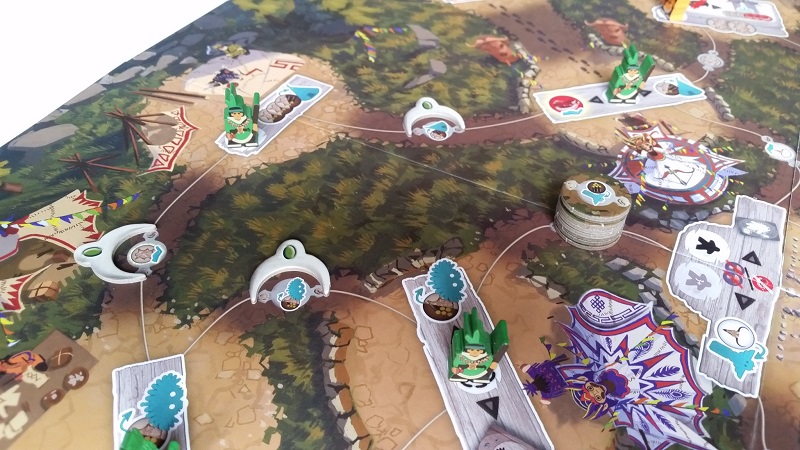À chaque tour, seulement 6 nomades parmi les 8 seront placés. À nous de choisir quels pions de couleur privilégier pour réaliser les liaisons (des actions gratuites) les plus intéressantes. Cette répartition a son importance puisque si 2 nomades de couleurs différentes (non ce ne sont pas des indiens !) ne déclencheront pas les liaisons, ça serait trop facile.