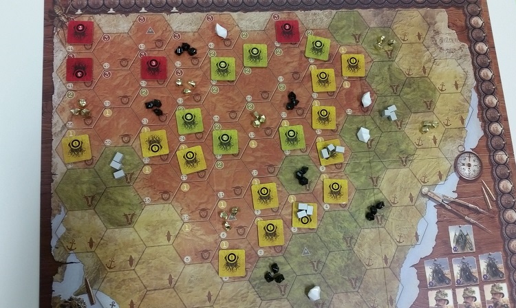 La partie s’arrête lorsque nous et notre adversaire dépassons la case 53 du plateau. À ce moment, on comptabilise nos points ainsi que ceux de l’adversaire et c’est celui qui en a le plus qui gagne. Mais une défaite anticipée est possible si un des Grands Ancien parvient à détruire notre port. Voilà pour les grandes lignes.