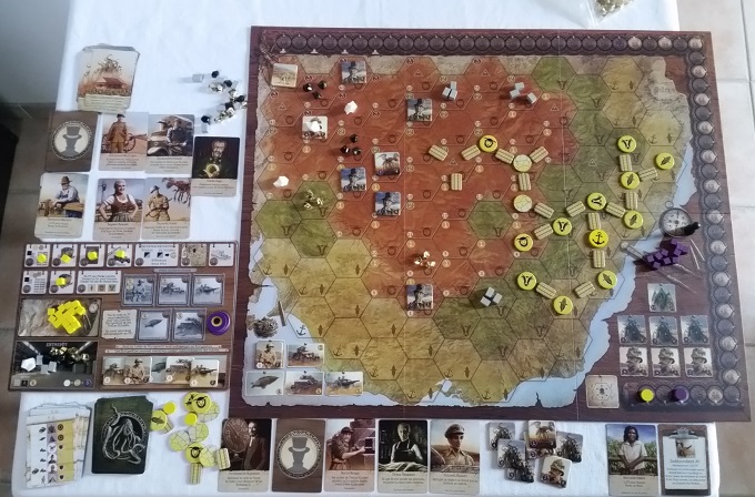 Au bout de quelques parties on se rend compte que le hasard est parfois taquin avec nous. Sur le papier un combat peut être gagné parce qu’on a les bonnes troupes, mais dans les faits, tout peut chavirer du fait de mauvais tirages de cartes Combats. En effet, la résolution des combats se fait en tours successifs où l’on décide si on continue ou si on sonne le repli (un stop ou encore quoi). Et si on tente trop le diable et qu’on ne sait pas s’arrêter à temps, paf on perd ses troupes ! Apprendre à battre en retraite au bon moment et composer avec l’aléatoire est fondamental ici.