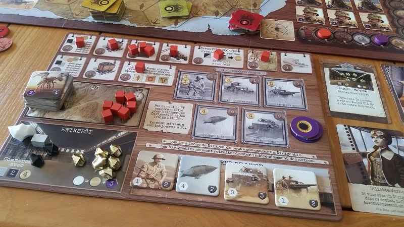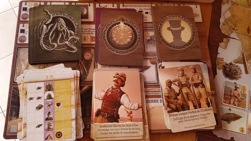 Chaque action nous coûte des points de Temps qu’on comptabilise sur une piste. À partir du moment où notre pion dépasse la case 22 de la piste, notre adversaire virtuel entre dans la partie et jouera des cartes de son paquet personnel et qui auront des répercussions sur le plateau (assassinats, déplacement des Grands Anciens…). Et comme dans Olympos, Patchwork et d’autres jeux qui exploitent ce même principe, c’est au dernier joueur sur cette échelle de Temps de jouer.