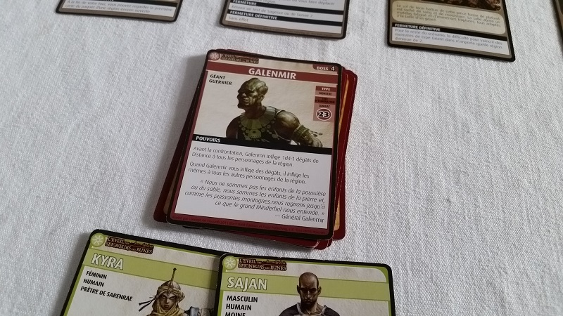 Le solo du jeu est imbriqué dans la mécanique même. Le joueur solitaire a donc la possibilité de diriger un ou plusieurs aventuriers. Cependant, comme dans d’autres jeux de cartes (je pense à Horreur à Arkham JCE dont il se rapproche), pouvoir jouer un seul personnage est toujours alléchant, mais nécessitera de devoir compenser ses faiblesses par des équipements ou des objets lui permettant de faire face à un maximum de situations. Jouer à deux personnages permettra de gagner en souplesse, profiter d’aides éventuelles pour réussir un test délicat, mais aussi d’exploiter les capacités de personnages « Soutien » qui sont inappropriés en solo pur… À vous de trouver votre style (comme dirait Christina Cordula).
