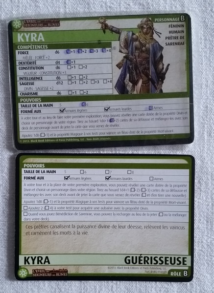 Ce qui va changer en fonction du nombre de personnages gérés c’est le nombre de régions à explorer (un personnage = 3 régions, deux personnages = 4 régions…). À l’inverse, ce qui ne change pas c’est la pioche de 30 cartes Bénédictions qui va servir de compteur de tour et chaque scénario doit être achevé avant que ce paquet ne soit vide, sinon c’est la défaite et le retour à l’auberge.