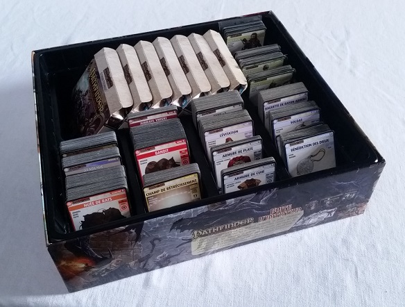La mauvaise nouvelle c’est que si vous protégez vos cartes, ça ne rentre plus dans les compartiments et c’est dommage parce que les cartes ne sont pas d’une qualité exceptionnelle pour un jeu où on va régulièrement les mélanger et remélanger…