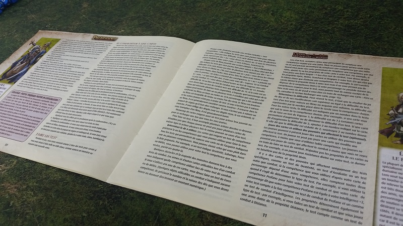 Là où le jeu pêche, c’est du côté sa règle qui est particulièrement mal pensée et paginée. Elle se compose de paragraphes volumineux, peu espacés et qui rendent la recherche complexe lorsqu’il s’agit de trouver un renseignement particulier. Il y a bien une Feuille de Référence en dernière page mais cette dernière est incomplète. Le retour dans le livret est donc indispensable et rallonge inutilement notre expérience. Un index aurait été apprécié mais non, on nous condamne à feuilleter pages après pages pour tomber par chance sur ce qu’on cherche. Pour un rôliste habitué au Livres de règle volumineux ça peut passer, mais pour un joueur de jeu de société lambda c’est aride.