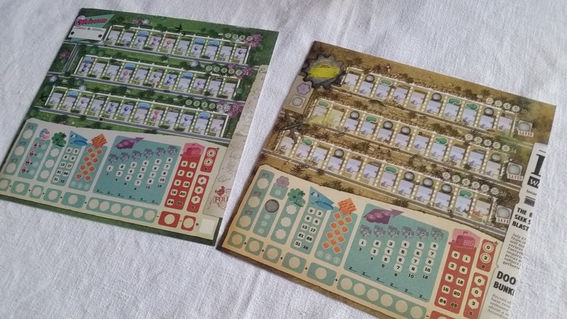 La première partie est assez surprenante car on joue beaucoup plus concentré qu’avec le jeu de base. Premièrement parce que les objectifs thématiques des nouvelles feuilles Pâques et Guerre Atomique ne sont pas faciles mais aussi parce que le score de notre adversaire dépend directement des cartes qu’on lui laisse.