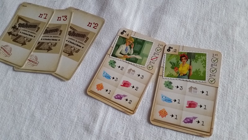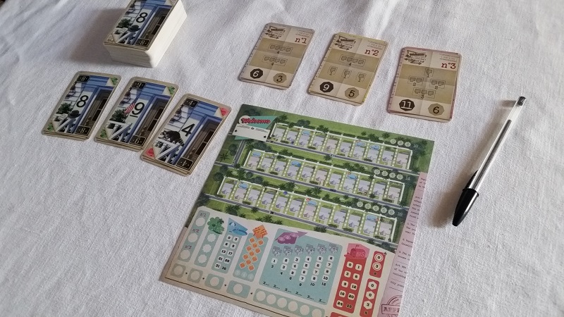 Sorti début 2018 chez le très toulousain Blue cocker, Welcome to your perfect home (dit « Welcome to« ) nous glisse dans la peau d’un/une architecte en charge de construire un joli quartier composé de 3 rues. Le jeu appartient à la catégorie des « roll & write » c’est-à-dire que le joueur a un stylo et une feuille de marque, il fait rouler les dés (ici ce sont des cartes tirées mais c’est le même principe) et en fonction des possibilités offertes, il coche/écrit sur sa feuille le choix réalisé.