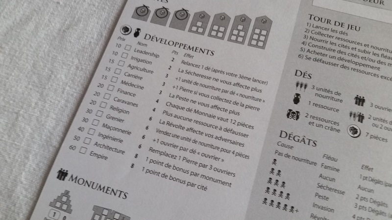 Ce qui est également agréable c’est le fait que plusieurs stratégies sont possibles. On tente des combinaisons entre les Développements pour faciliter les constructions de Monuments ou sur la création de cités pour avoir plus de dés à jeter par tour. C’est varié et plaisant.