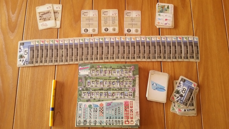 On récupère alors le paquet de notre adversaire, l’étaler sur la table et en fonction de son barème de points, iel va marquer plus ou moins de points dans les différent domaines du jeu. Ainsi, pour chaque carte Barrières cela rapportera X points, Y points pour les piscines, chaque Agent immobilier va augmenter la valeur du lotissement où il est construit, etc.