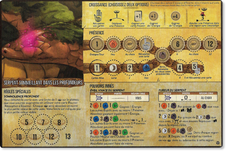 Ne vous y méprenez pas, ces deux esprits du pack Promo sont très complexes et destinés aux grands stratèges. Un simple regard sur leur fiche de pouvoir et c’est la migraine, au bonheur des gamers expérimentés. Le Serpent Sommeillant dans les Profondeurs, long à la détente comme son nom l’indique, mais très fort en fin de partie, agissant sur vos coéquipiers et à grande échelle. Enfin le Cœur du Feu Sauvage, la destruction pure par le feu, a un double effet Kiss-Cool : il va tout brûler et forcément créer de la Désolation.