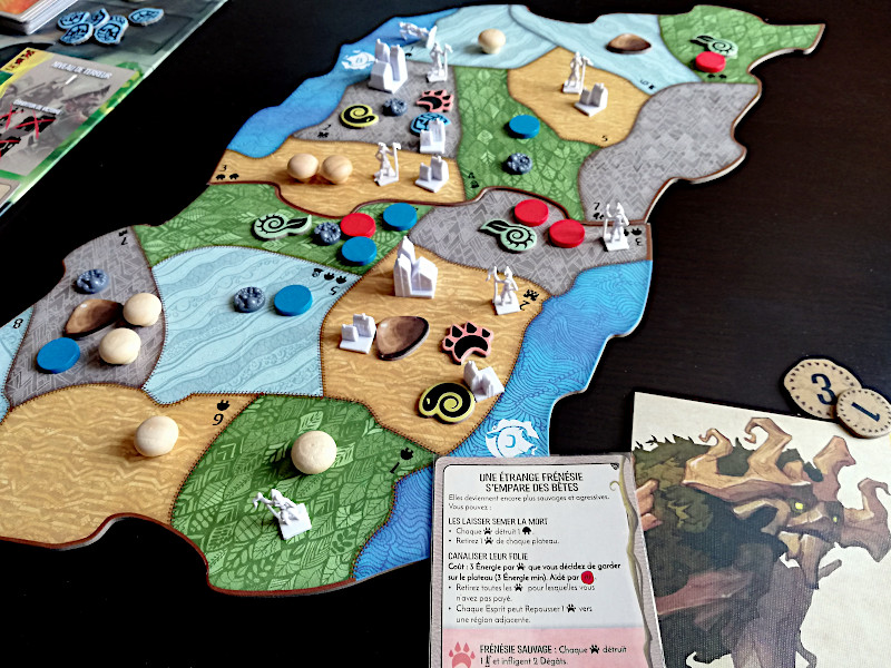 Les premières tentatives sont hasardeuses. Exit la prédictibilité et la régularité du jeu de base ! Certains événements sont plus dévastateurs que d’autres, pour le meilleur ou pour le pire. Oh, et puis leurs effets sont parfois un peu titrés par les cheveux, agissant lors de futures étapes du jeu. Tout cela va faire chauffer ma mémoire vive. Mais pas de panique : on découvre après coup une nouvelle facette de Spirit Island. Les effets des cartes Événement étant multiples, si notre plan A venait à tomber à l’eau, il apparaît souvent un plan B ou C, D… que l’on pourra mettre en œuvre immédiatement. Cela sera d’autant plus le cas avec la présence des nouveaux jetons Bête, Ronce, Maladie et Discorde sur le plateau, qui vous donneront des avantages et élargiront grandement le champ des possibilités.