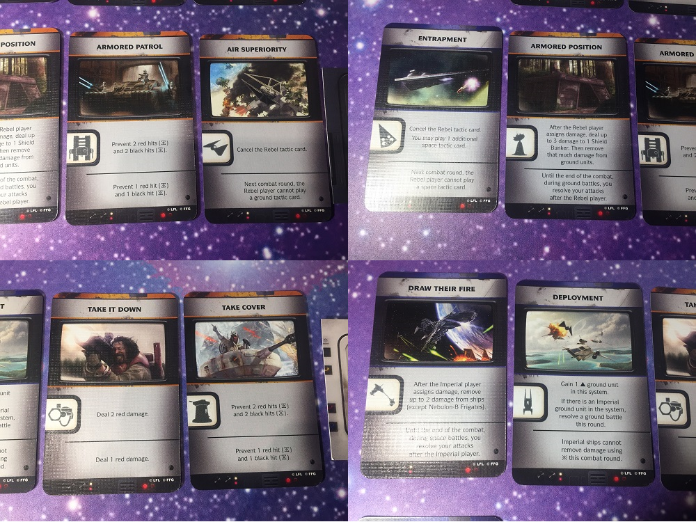 Une fois toutes les cartes jouées, on les reprend en main. C’est un bon vieux système que l’on trouvait déjà dans Le Trône de Fer par exemple. Il pousse à diversifier ses unités afin de pouvoir maximiser les effets de ces cartes. Les effets peuvent être assez violents et il va falloir apprendre à les maîtriser et les anticiper. Vous trouverez quelques exemples ci-dessous pour vous faire une idée. Le TIE Striker a un effet dans les combats spatiaux et terrestre. C’est l’intérêt principal de cette unité, très thématique du reste.