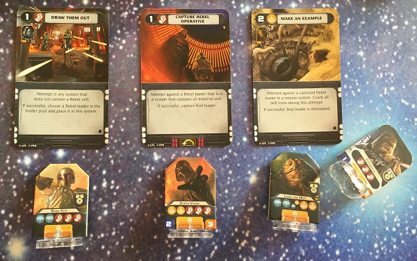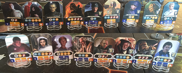 Ces héros se rajoutent à ceux qui peuvent arriver en cours de partie, on ne les verra donc pas systématiquement. Notre partie a vu Saw Gerrera, le Directeur Krennic et Jabba Le Hutt (ou Jabba le Bûcheron, comme on disait dans les années 80).