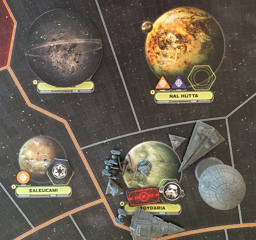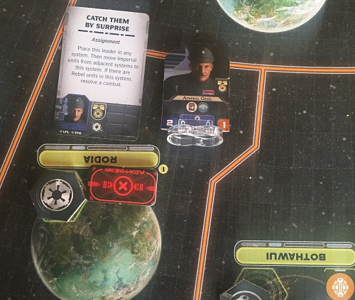Alors que la flotte rebelle basée à Rodia menaçait de bondir sur une petite flotte impériale située à Naboo dès la première action et s’éloigner de la menace de l’Étoile Noire, l’Amiral Ozel ne s’en laisse pas compter et sort un atout de sa manche : il active Rodia dès la phase de programmation et rassemble là la petite flotte et une flotte plus conséquente. Le combat est terrible, la flotte rebelle est annihilée dès le premier round de combat, et les troupes au sol connaissent le même destin funeste. Il ne reste plus aucune force rebelle conséquente, si ce n’est dans la base. Ça ne va pas aider les leaders rebelles à s’occuper !