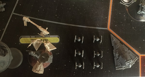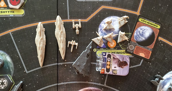 Les Rebelles jettent alors toutes leurs forces sur l’Empire aux abois : l’amiral Ackbar une fois encore attaque une flotte venue survoler le système de Cato Neimoidia dans lequel se tapit sournoisement la base depuis le début. Un Destroyer détruit ! Un point de victoire !