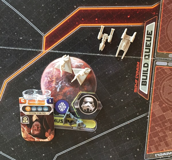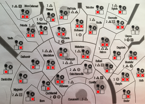 En face, les Rebelles se demandent bien ce qu’ils vont faire de leurs deux cartes missions de libération de leader. Pour tromper leur frustration, ils font un raid sur la piste de production de l’Empire et, comme l’expérience est couronnée de succès, ils effectuent une mission de reconnaissance pour récupérer cette carte et recommencer. Ceci plus l’utilisation d’explosifs d’usine et un sabotage massif de Saw Gerrera assez peu contré limite les renforts de l’empire. Mon Mothma ne ménageant pas ses efforts pour rallier toujours plus de systèmes à la cause rebelle, la production d’unités est honorable, malgré un grignotage de l’Empire qui passe derrière pour soumettre les systèmes nouvellement acquis à la cause.