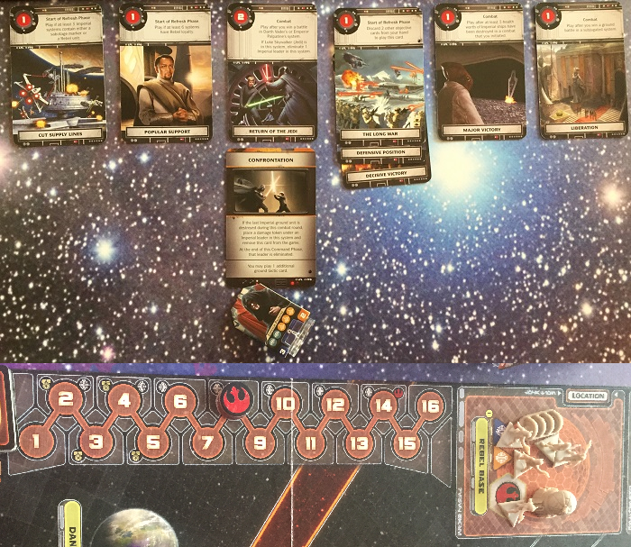 À la fin du tour, les rebelles se décident à jouer un objectif qui nécessite d’en défausser deux pour marquer un point. Ils ne sont plus qu’à deux points de la victoire après l’avancée du marqueur de tours.