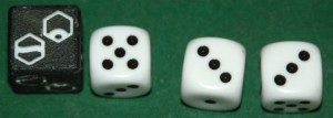 Voilà le matériel. Nous allons jouer avec le dé noir custom et autant de dés blanc que de joueurs +1.