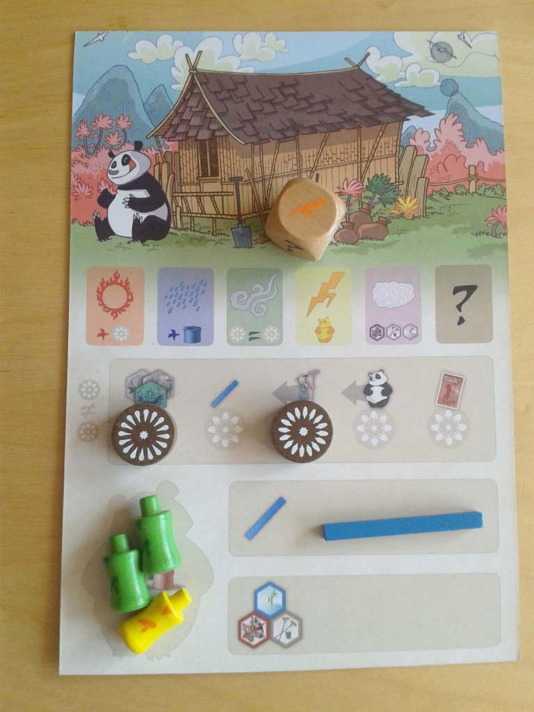 On rajoute des figurines moulées et peintes de première qualité pour représenter le panda et le jardinier, des jetons d’action en bois délicatement décorés, des plateaux individuels qui servent d’inventaire et d’aide de jeu, trois petits paquets de cartes Objectif. Aucun texte sur le matériel de jeu. Tout est clair, aéré, d’un esthétisme et d’une légèreté maîtrisée.