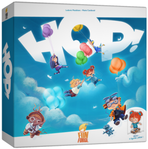 IntroductionHOP! est une des dernières nouveautés de Funforge, un jeu d’ambiance familial, plutôt pour les enfants à mon avis, qui vous propose de réaliser une variation de défis sur la base du « attrape moi ça au vol ! ». On se jette effectivement une sorte d’anneau entre « attrapeur » et « lanceur » avec parfois des « turbulateurs » – c’est-à-dire des joueurs qui essaient de nous empêcher d’y arriver. On gagne des points en lançant/attrapant/perturbant avec succès. Il est également possible de parier sur la réussite ou l’échec des lancers des autres.