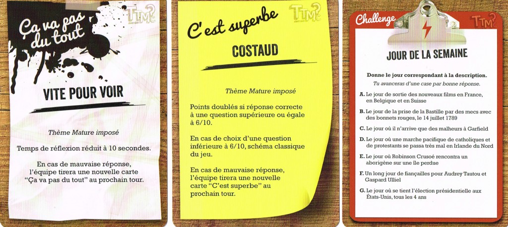 L’autre point important et intéressant du jeu est son plateau. En effet, les cases d’arrivée des pions des équipes marquent la catégorie des thèmes qui seront posés, de même que la présence des cases Challenge/Bonus/Malus. Ce simple élément de gameplay permet de tordre le jeu, car il oblige les joueurs à majorer ou minorer les valeurs des questions qu’ils vont tenter, quitte à prendre parfois des risques sur des sujets qu’ils ne maîtrisent pas tant que ça. Par exemple je tenterais bien la question 2 sur les « vrais noms de célébrités françaises », mais si je réussis, mon pion va finir sur une case malus, qui risque de fortement m’handicaper pour la suite (par exemple il faut parfois avoir à répondre correctement à 3 questions pour espérer avancer à nouveau). Je vais donc devoir tenter une question de niveau 4, ce qui va mécaniquement m’exposer à plus de chance de me rater. Un petit risque en plus qui met du sel dans la partie.