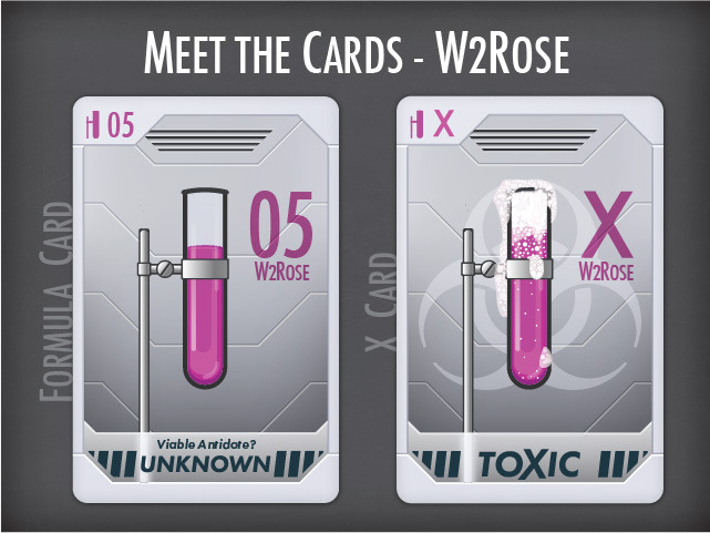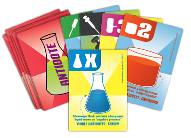 Au départ, une carte "formule" (THE Antidote) va être choisie au hasard sans que personne ne sache laquelle. Il y a 7 antidotes possibles. Le bon est mis de côté, face caché, les autres seront mélangés au jeu des joueurs, avec de simples cartes "Recherches".