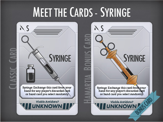 On mélange les cartes Antidotes et les cartes Recherches, et on distribue tout entre les joueurs. Note : Si on joue à 3, il y aura également 3 cartes "seringue", il s'agit de cartes spéciales.