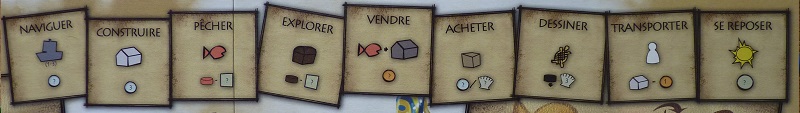 Il est possible d’acheter une denrée présente sur une case d’île adjacente au positionnement de son bateau, afin d’alimenter le marché extérieur et de gagner des points de prospérité.
