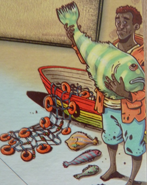 Le joueur peut vendre ses poissons si son bateau est situé sur une case de mer adjacente à une case d’île où il possède une cabane.