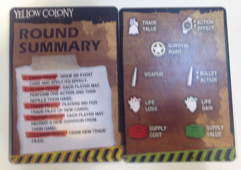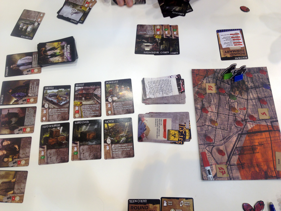 Le monde va très mal, les denrées sont rares, chaque colonie cherche des survivants. Le tour commence par un événement qui nous propose des choix plutôt désagréables comme perdre des points de vie ou des denrées. Ensuite, chacun choisit une action. Dans la phase d’enchère qui s’ensuit, nous allons pouvoir gagner de nouvelles cartes. Le twist qui a son importance : quand on dépense des cartes, elles sont détruites définitivement. Les ressources sont rares et périssables, cela donne vraiment la sensation d’en baver, d’autant que les événements sont assez raides.