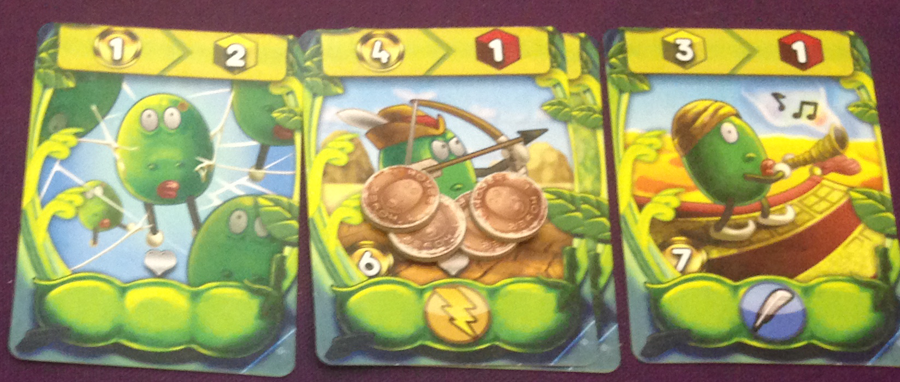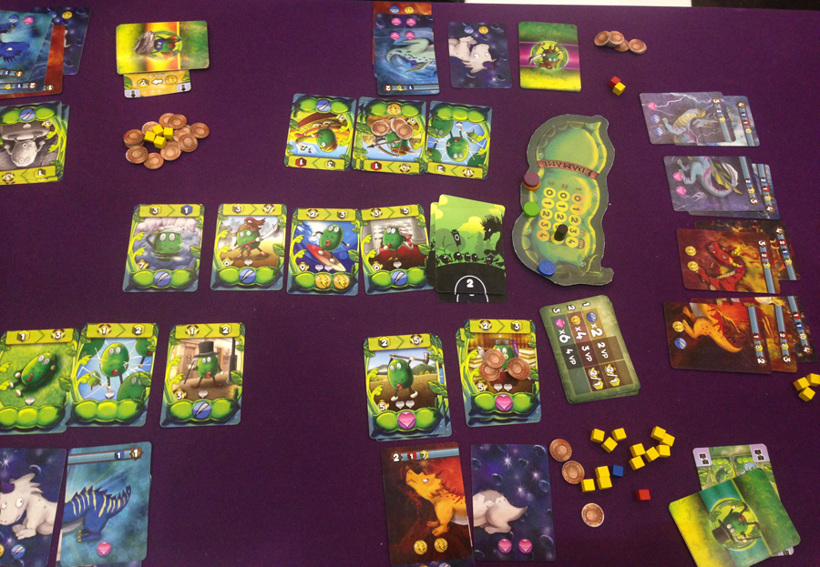 Cette fois nous sommes des Edamame, des graines de soja. Pour survivre, ils ont besoin de l’énergie de dragons. Le but du jeu est de « crafter » ses dragons pour les rendre plus puissants (avec des symboles éclairs) plus rapide (avec des plumes) ou plus résistant (avec des coeurs). À la fin de la partie, nous allons confronter nos dragons : pour chaque combat gagné on récolte 3 points de victoire, pour un match nul un point de victoire.