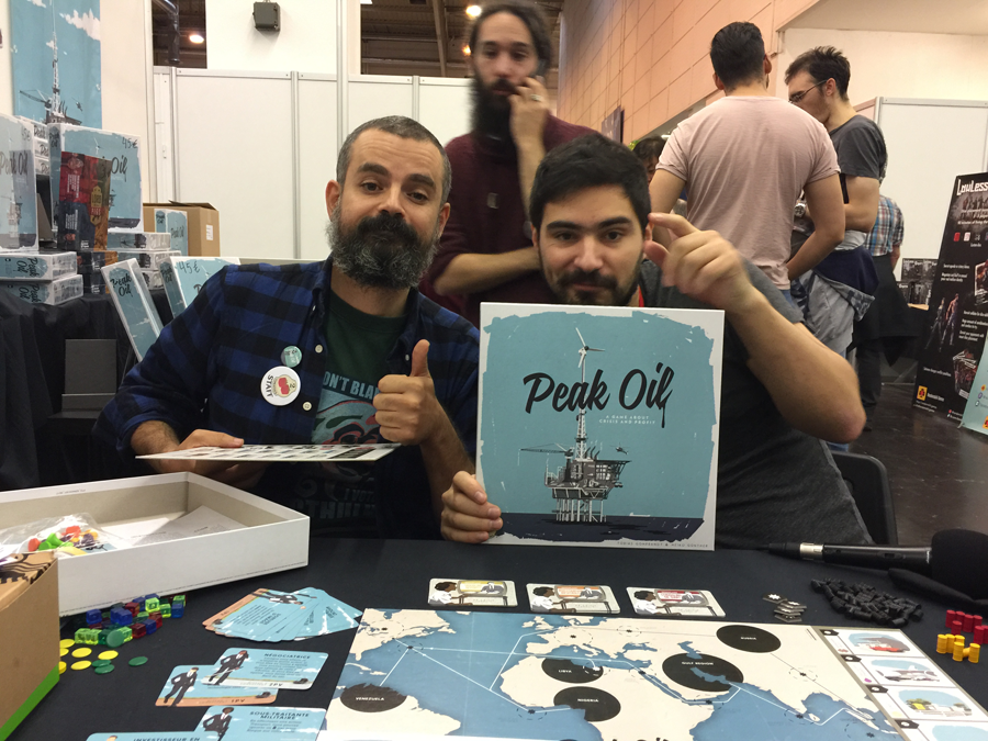 Peak Oil est un jeu plutôt disons sérieux. Les mécaniques contemporaines utilisées ici veulent clairement faire passer un message politique. Elles vous placent dans l’univers boueux des compagnies pétrolières. Et on va s’amuser à se salir les mains en se redorant le blason : comme on arrive en pénurie de pétrole, on va chercher à se renouveler en misant sur les énergies durables, dans l’éthique la plus profonde bien sûr. Oui enfin. Presque. Le jeu se veut cynique, causer de l’inconfort dans ce qu’on fait si l’on y pense, tout en gardant une bonne dose de fun en jeu. Nous nous avouons assez respectueux devant la démarche. Reste à voir si l’essai se transforme à la table d’un point de vue ludique. Ça tombe bien, on a pris une boîte.