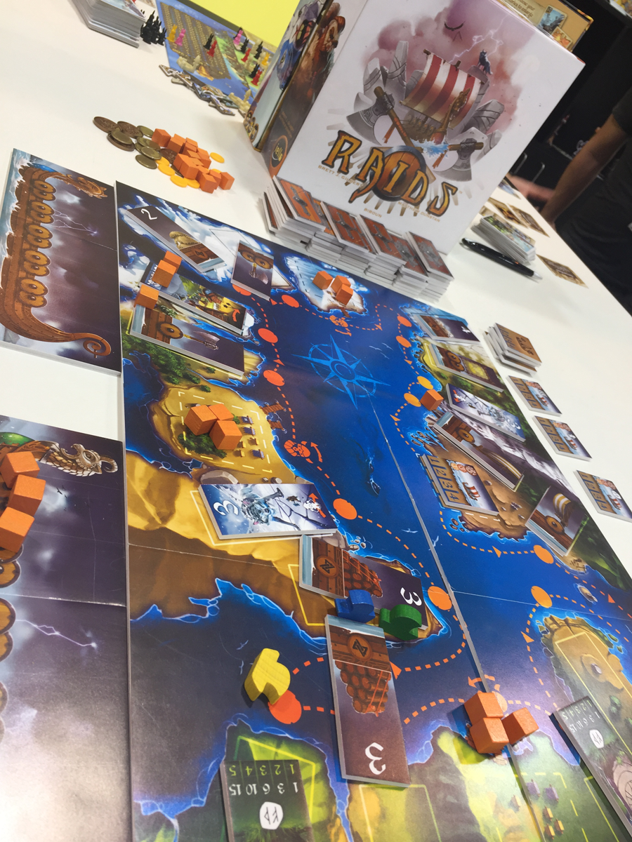 Raids, un futur Iello, est un jeu où (devinez quoi ?) on fait des raids vikings (surprise surprise, le thème viking frétille encore pour 2018 !), le tout chapeauté par les brillants auteurs d’Elysium (M Dunstan & B Gilbert), ça n’augure que du bon. Votre drakkar partira du port pour faire un petit tour en mer avec les escales que vous déciderez, pour chacune d’elles vous gagnerez un avantage en nature, à moins qu’un adversaire ne vienne vous tirer dans les pattes ! Auquel cas un combat frontal devra s’engager… Il s’agit de bien se placer, de choisir ce dont on a besoin avec soin, et d’améliorer son bateau (plateau personnel) pour gagner un max de points (lointains arômes de Piratoons ?).
