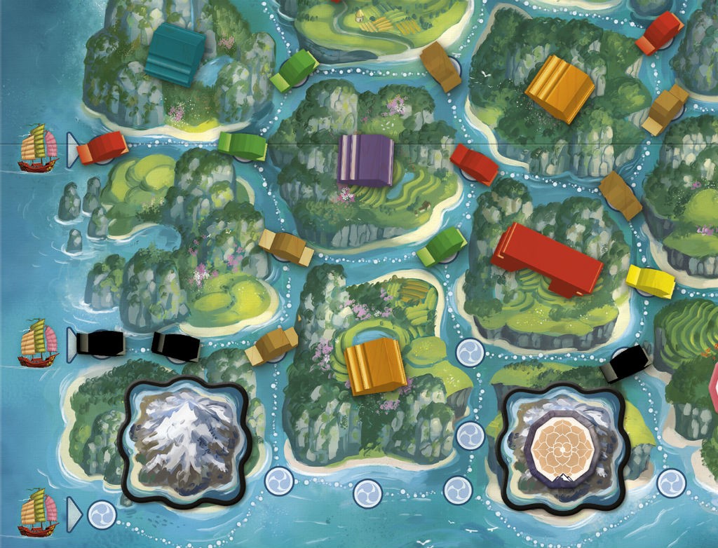 Les bateaux sont de différentes couleurs qui symbolisent des ressources, par ordre de rareté : or, argile (rouge), pierre (gris), bois (marron) et bambou (vert)