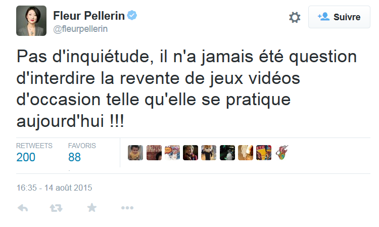 Bref, madame la ministre s’est rendue compte que son message était peut-être un peu abusé et a essayé de minimiser par la suite avec un petit tweet, style « Mais non, je ne suis pas contre l’occasion en fait, hein ». Bah oui, c’est-à-dire que les vilains qui osent vendre des choses qui leur appartiennent ont tout à fait le droit de le faire, d’après la loi européenne, par contre les éditeurs qui vendent des objets virtuels sous verrous numérique dans le jeu vidéo contournent joliment ce droit…