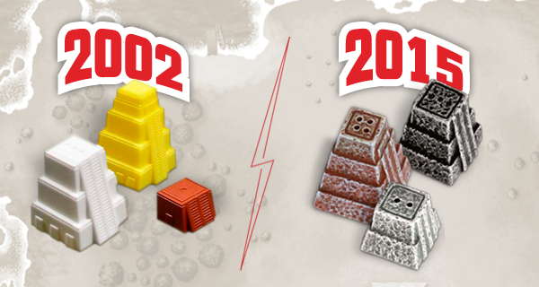 La remarque de chaque joueur prenant en main son sachet a été : « Oh c’est lourd ! ». En effet les pyramides qui étaient en plastique (voir photo de comparaison ci-dessous empruntée au site de Super meeple) en 2002 elles sont désormais en résine. Au-delà du poids, la texture et l’apparence donnent l’impression de pierre.