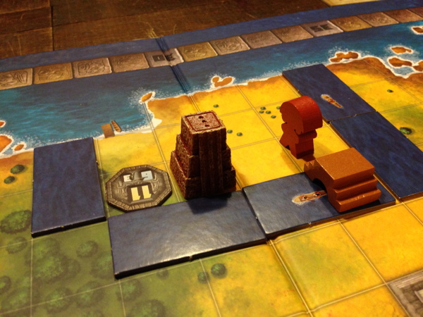 Mais rentrons un peu plus dans le détail de ses actions : se déplacer d’une case = 1 point d’action (sont résumées toutes les formes de déplacement sur l’aide de jeu) ; construire un canal = 1 point d’action ; construire une pyramide = 1 point d’action par étage de la pyramide. Le déplacement libre coûte 5 points, et l’on peut économiser 1 ou 2 points d’action qu’on pourra dépenser plus tard lors d’un tour ultérieur. Très simple, et surtout entraînant finalement peu de réflexion quant à l’optimisation de ses points d’action. En revanche, la réflexion viendra de l’optimisation de ses déplacements et du lieu de construction des canaux. Quoi de plus normal pour un jeu de placement/majorité finalement ?