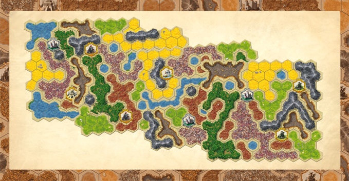 Le principe de Kingdom Builder est redoutablement simple : vous avez un plateau modulaire représentant des terrains sur des hexagones et à votre tour, vous piochez une nouvelle carte terrain et placez 3 de vos pions cités de façon adjacente sur le type de terrain représenté sur la carte en question.
