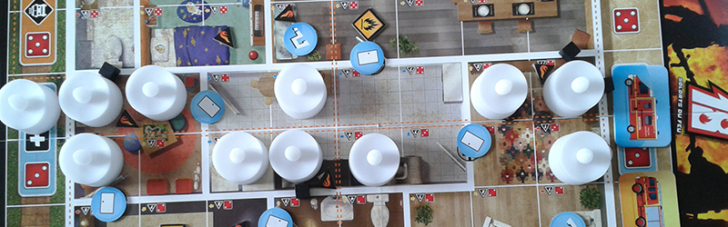 Dans 18, soldats du feu, nous devons éteindre des incendies. Le feu est matérialisé par des jetons en carton que l’on pose sur le plateau, ce qui ne met pas vraiment dans l’ambiance.
