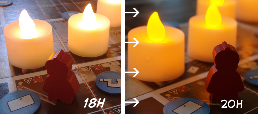 J’ai donc eu l’idée d’utiliser des bougies à piles pour simuler la lumière créée par les flammes. Elles font la taille d’une case et donnent un petit effet très sympathique dans une semi-pénombre. La boîte que j’ai acheté m’a coûté un peu moins de 10€ pour 12 bougies. Livrées en un jour ouvré, j’ai pu profiter de mon achat dès le lendemain. Le plus long reste de les allumer.
