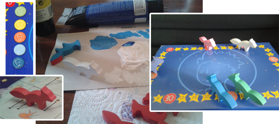 Les pions du Petit Prince sont de minuscules morceaux de carton qu’il faut surveiller à chaque sortie pour ne pas en égarer par mégarde. Je voulais quelque chose de plus pratique qui fasse tout de même référence à l’univers de Saint Exupéry. Heureusement, Tout pour le jeu propose des pions renards que je me suis dépêché d’acheter en 5 exemplaires. La couleur de base n’est pas dérangeante, puisqu’ils se peignent facilement.