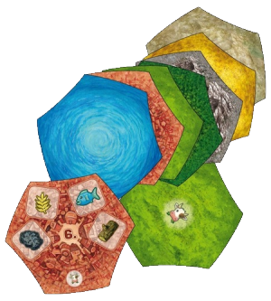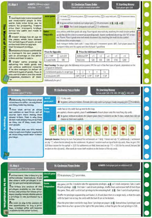 tous les jeux utilisent une carte, elle-même modulaire puisque constituée de tuiles hexagonales : villes et terrains (plaine, montagne difficile d’accès, eau infranchissable…). Cinq modèles de cartes prédéfinis sont imposés par certains des modules, ou bien encore, la carte va se former au cours du jeu.- tous les jeux utilisent la notion d’argent et de revenu