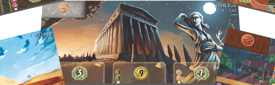 Ici chaque joueur débute avec 7 sous, et 4 cartes Merveille. La construction d’une Merveille vous donnera une capacité spéciale, comme la possibilité de rejouer tout de suite. 7 merveilles seulement peuvent être bâties dans tout le jeu, ainsi, si un joueur arrive à construire les 4 siennes, cela signifie que l’autre en aura construit que 3… Du coup là aussi c’est la course !