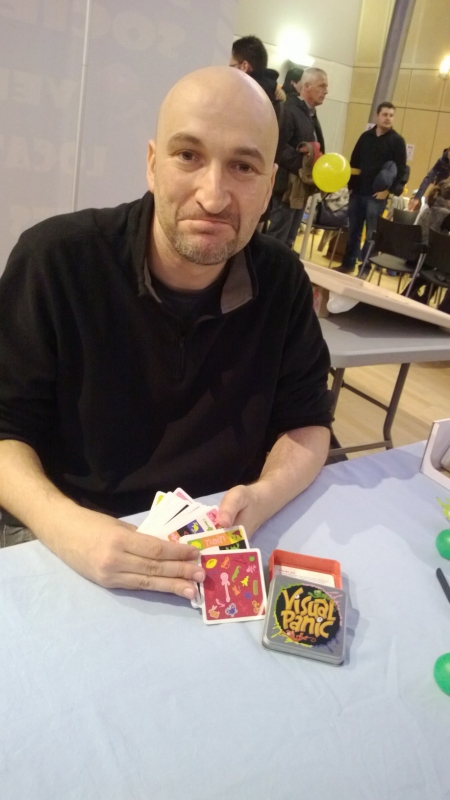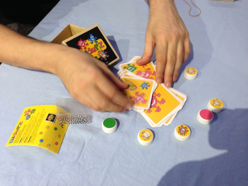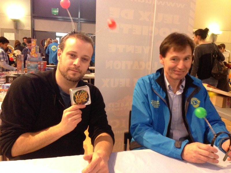 Monsieur Alexandre, très sympathique au demeurant, nous confie non sans enthousiasme qu'un de ses protos va être édité en mai/juin chez Gigamic, un jeu d'observation / rapidité façon bazar bizarre qui s'appelle "Bidulz" pour le moment (mais ça va changer) où il faudra attraper des objets. Mais chuut, c'est top secret !