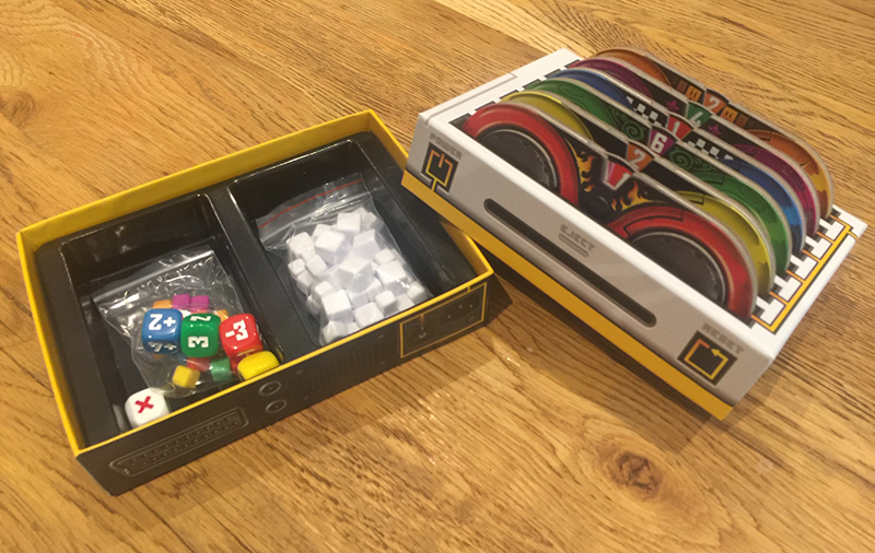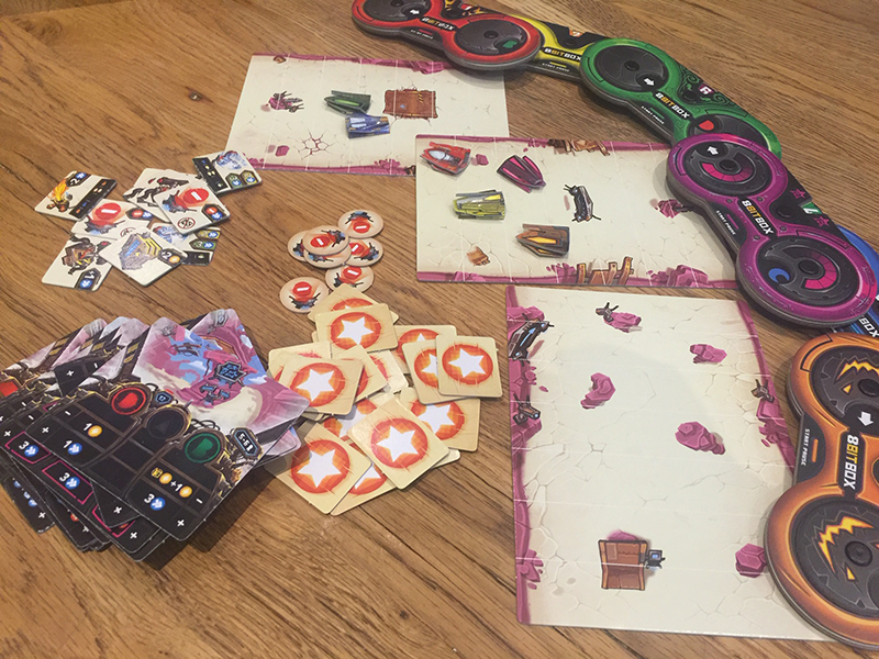 Le matériel est plus conséquent avec 6 petits (tout est toujours petit dans la 8 bit Box) vaisseaux, ses tuiles « couloirs à prendre », ses 3 plateaux et ses jetons bonus / malus (pour attaquer, se défendre ou récupérer du fuel).