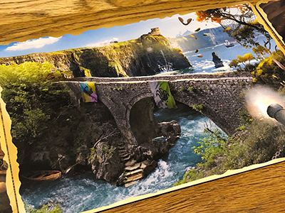 Premier tour, on râle encore un peu, pour la forme : « Comment vais-je bien pouvoir vous faire devenir quelle île est la mienne avec tout ça ? ». En effet, un ensemble de tuiles représentant des îles minutieusement illustrées sont placées devant tous les joueurs. Vous avez chacun trois cartes Lieux qui secrètement indiquent quelles îles sont les vôtres. Puis, nous sortons des cartes postales qui sont en fait de très grandes illustrations (belles et détaillées). Là dessus, nous plaçons de petits jetons, comme des flèches, pour montrer un détail de l’image à nos camarades. Ce détail est censé leur dire quelle île est la notre. Montrer le serpent, la couleur de l’eau, la forteresse en bois… Trouver sur l’image un lien, « le » détail, quelque chose qui permettra, si possible du premier coup, aux autres de définir quelle est votre île parmi la vingtaine présente.