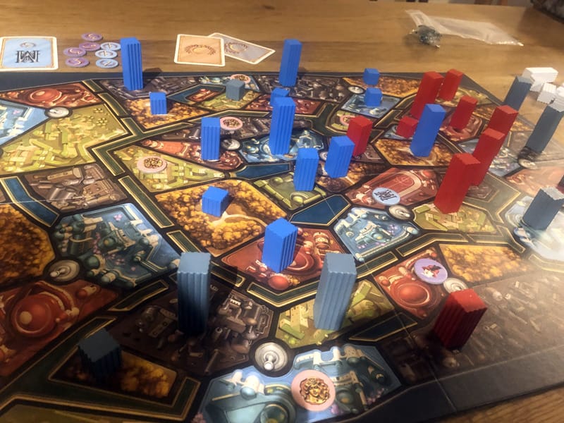 Nous allons construire sur le plateau nos buildings, ceux-ci sont numérotés de 1 à 13 et à mon tour je peux placer un Building dans la zone adjacente au dernier building posé, mais avec une valeur plus forte que le dernier building. Jusqu’à ce que tout le monde passe, et le gagnant peut installer son building, tandis que les autres vont récupérer les leurs, et il relance avec un building de la valeur de son choix dans une autre zone. Le jeu se termine quand un joueur a placé tous ses buildings. Le plateau est délimité en districts avec des murs et des ponts qui nous permettent de se déplacer dans le district adjacent. Le placement de départ est important, on ne peut pas toujours faire ce que l’on veut à son tour mais on peut utiliser aussi le terrain à son avantage.