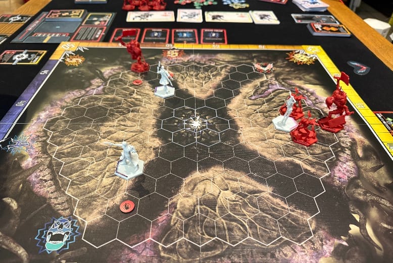 Deux bonnes nouvelles pour votre capacité à comboter. D’une part, certaines cartes sont des Basics qui retourneront dans votre réserve (toujours dispo en plus de votre main), ce qui permet d’assurer un minimum le coup. D’autre part, en touchant les monstres, on pourra ensuite récupérer des jetons qui fonctionnent comme une monnaie pour acquérir des cartes et améliorer notre deck. Bref, le côté escarmouche (le positionnement est clef pour toucher et … pas décéder) & deck-building fonctionne bien. Gare à ne pas acheter n’importe quoi car il n’y a pas d’épure possible.