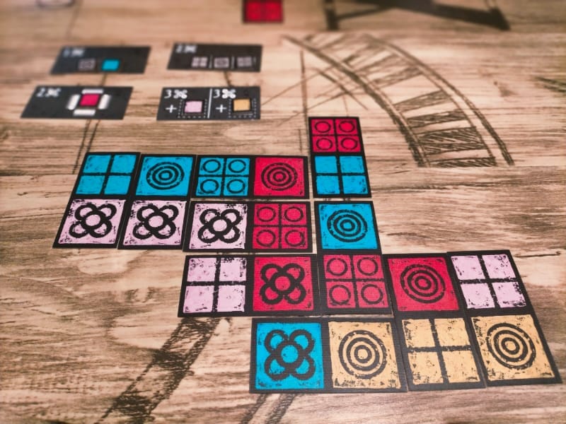 Si vous n’avez jamais foulé les trottoirs de Barcelonne, ce jeu vous propose de les voir de près. Les panots sont les pavés à motifs en ciment. Et en couleur (dans le jeu). Panots est un jeu de patterns et de rapidité, mais où la lenteur n’est pas trop pénalisante. Pour une partie vous allez tirer les trois patterns d’assemblage de panots qui vous feront scorer : suite de motifs, couleur, majorité… À chacune des 10 manches, vous aurez le choix parmi des cartes composées de deux panots. Le choix si vous êtes rapide et que vous savez ce dont vous avez besoin. Sinon il vous restera toujours un choix entre les deux derniers. Et on y arrive même quand on est lente comme moi, car on trouve toujours une place pour placer une carte, de façon adjacente ou en recouvrement. Finalement peu de contraintes, si ce n’est que courir après quatre scoring peut faire fumer un peu les neurones si on veut tout optimiser.