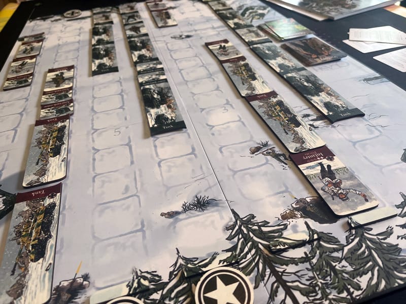 Le plateau et l’univers visuel font penser à un wargame mais en réalité, c’est plutôt un jeu abstrait. À notre tour, on va jouer nos tuiles char, infanterie ou encore mines antichar sur une des lignes de front. Nous avons plusieurs points d’action à dépenser. On peut rusher sur ses lignes ou essayer d’enfumer l’adversaire en dispersant nos forces et en le bloquant si l’on voit qu’il va gagner une des lignes.