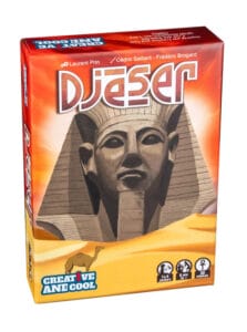 Djezer était un pharaon qui a fait construire la première pyramide en 2650 av. J.-C. Sans surprise, dans ce petit jeu de cartes, vous allez faire pareil. Avec vos 3 points d’actions, vous allez pouvoir récupérer des cartes dans le Nil, qui compose une… rivière de cartes, puis les poser pour ériger votre pyramide ou agir sur les pierres maudites. Les cartes pierre ont une couleur et une valeur. On construit d’abord la base puis on monte. Les pierres du deuxième et troisième niveaux doivent avoir une valeur qui est la somme ou la soustraction des pierres qui la soutiennent. Enfin, il est à noter qu’une couleur et une valeur de pierre est toujours maudite, donc il est interdit de les prendre depuis le Nil ou de les placer dans sa pyramide. Il y a aussi 3 objectifs publics communs. Quand une pyramide est complète, on termine le tour et le jeu prend fin.